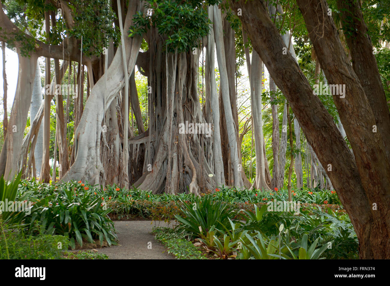 - Spanien Teneriffa Puerto De La Cruz Botanischen Garten Grossblattrige Feige Ficus Macrophylla Mit Gewaltigen Luftwurzeln Stockfotografie Alamy