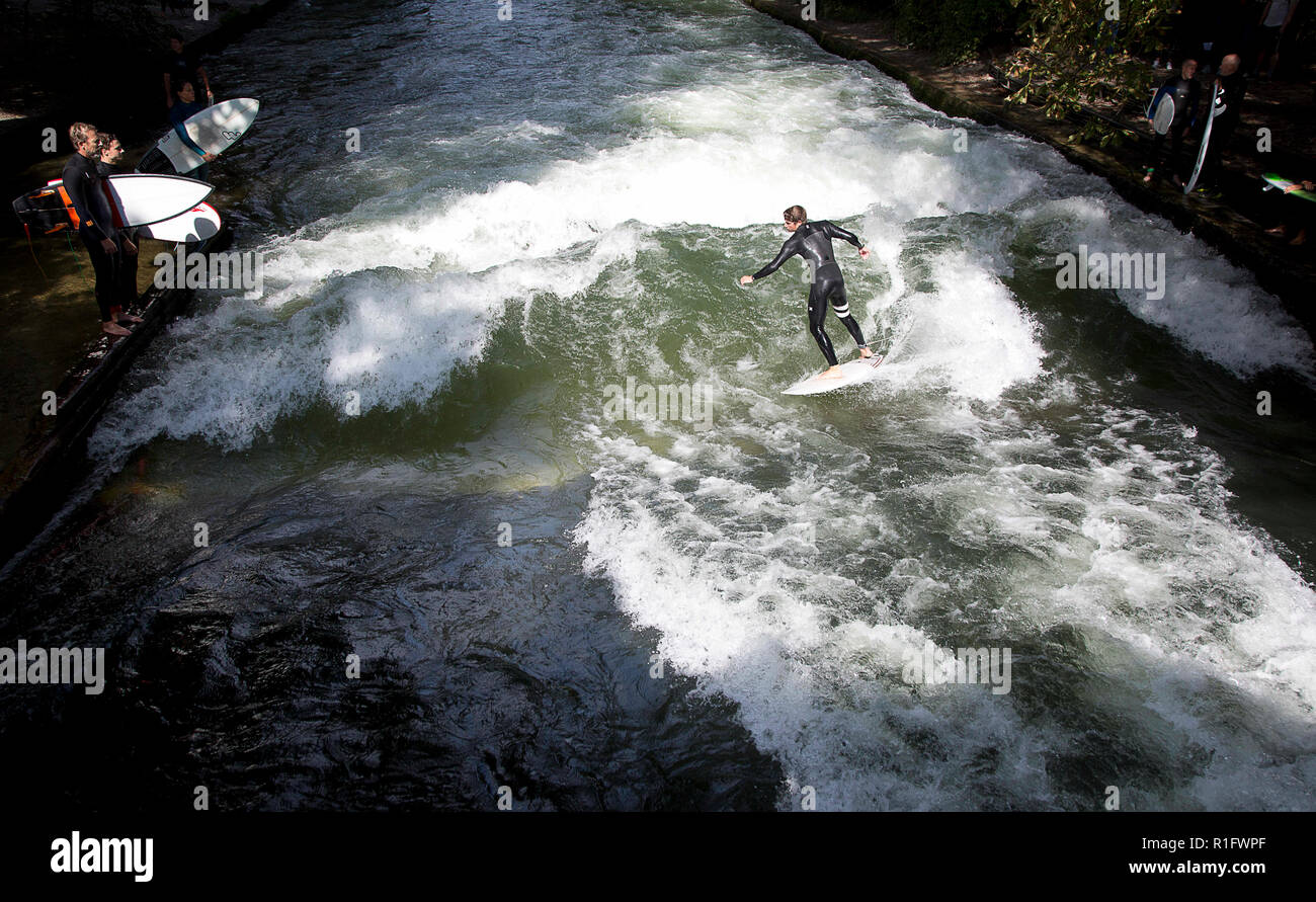 Munich Bavaria Germany 13th Oct 2018 September 20 2018 A Surfer Rides The Wave On The Eisbach Which Is A Manmade Side Arm Of The Isar River And Flows Thru The Englischer Schoene Gaerten Hessen