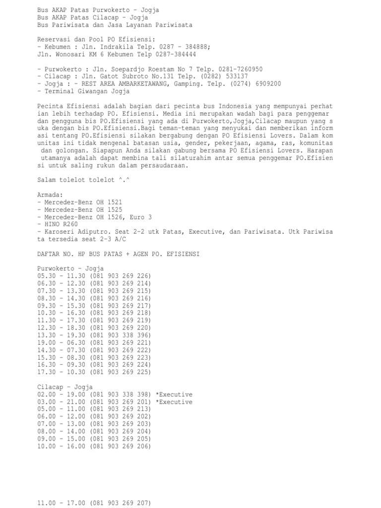 Jadwal dan tarif bus efisiensi jurusan kebumen ke yogyakarta efisiensi book efisiensi bus ticket at traveloka. Pool efisiensi kebumen 24 01 2015 diambil saat perjalanan dari purwokerto ke jogja pake kamera hp samsung galaxy ace 2 edit nambah brightness mengurangi resolusi dan ukuran file pake adobe photoshop cs5 jurusan cilacap dengan warna dominan hijau jurusan purwokerto dengan warna dominan orange. Efisiensi ambarketawang melayani jurusan yogyakarta ke cilacap purwokerto dan purbalingga dengan bus patas dan smart bus.